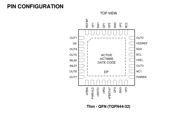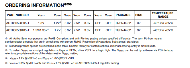 该设备具有三个DC/DC降压转换器和四个低噪声、低压差线性稳压器。三个DC/DC转换器采用高效率、固定频率(2MHz)、电流模式PWM控制架构,所需外部组件最少。其中两个DC/DC转换器可提供高达1150mA的输出电流,而第三个可提供高达1300mA的输出电流。所有四个低压差线性稳压器都是高性能、低噪声的稳压器,可提供高达320mA的电流。ACT8865采用紧凑的Pb-Free、RoHS兼容TQFN44-32封装。