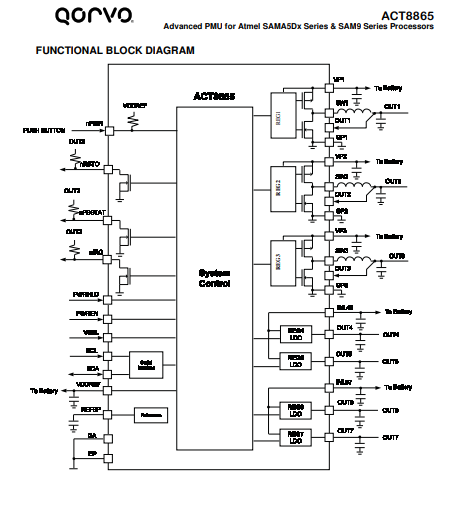 ACT8865是一款完整的、成本效益高、高效的ActivePMTM电源管理解决方案,专为Atmel SAMA5D2系列、SAMA5D3系列以及SAM9系列处理器(包括SAM9G[15/25/35/45/46]、SAM9X[25/35]、SAM9M[10/11]和SAM9N[11/12])的独特电源、电压排序和控制要求而优化。它非常适合用于便携式、低功耗、高性能的嵌入式系统。