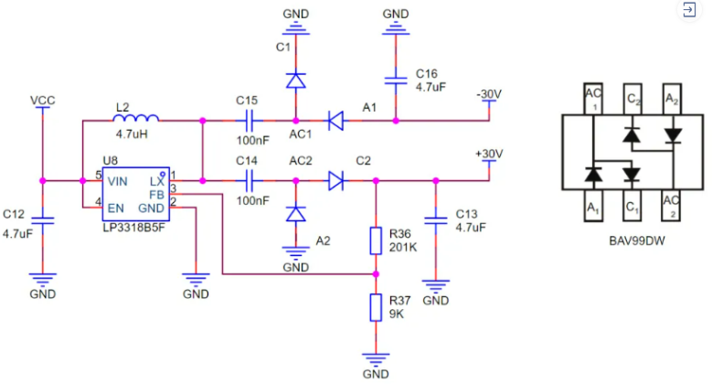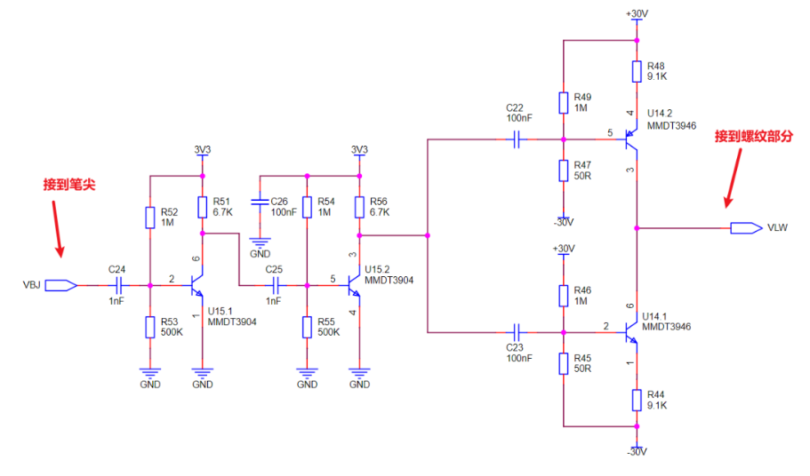 上次分析到电容笔控制板的电源部分是输出±30V给前面的三极管电路,本期就是将三极管部分与各位道友简单的分享一下,电源部分电路如下所示: