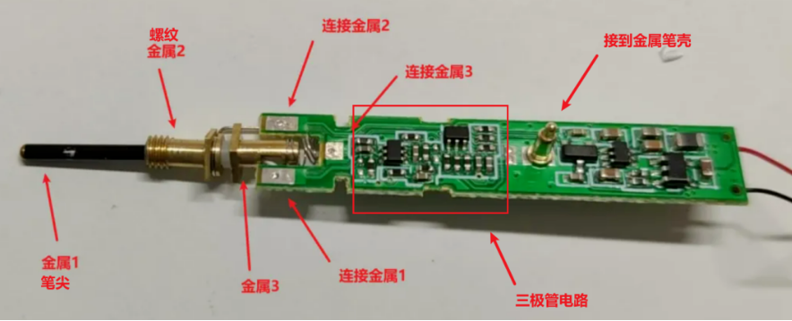 三极管模拟输出部分如下所示,看起来就是三极管组成的放大电路,可能是通过拾取笔尖的信号然后通过放大后再输出给螺纹部分的笔头。图中的R47和R45的阻值很奇怪,是50Ω(感觉有点小),这个阻值是拆下来后测量得到的,所以应该也不会有错: