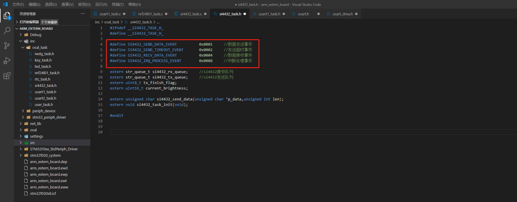 在头文件si4432_task.h中,定义了各种任务事件,主要有数据发送和接收,超时处理,以及中断事件,如下图所示。