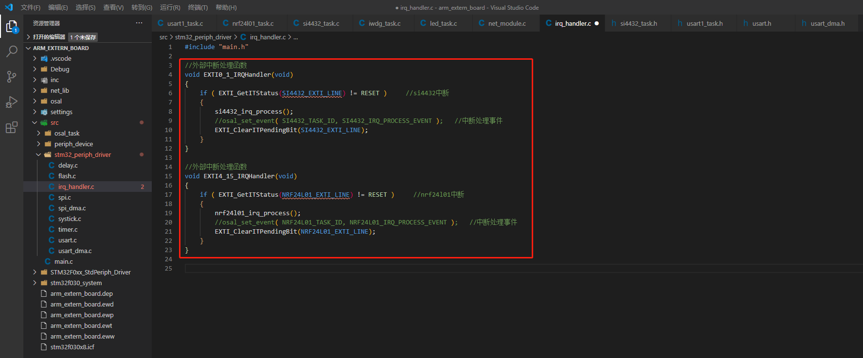 由硬件原理图可知,不管是SI4432或nRF24L01模块,一旦接收到无线数据,都是通过引脚中断的方式来通知STM32进行处理的,因此,需要在STM32的外部中断引脚处理函数中,取出无线模块接收到的数据,如下图所示。