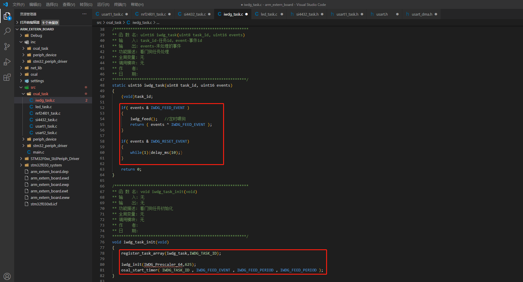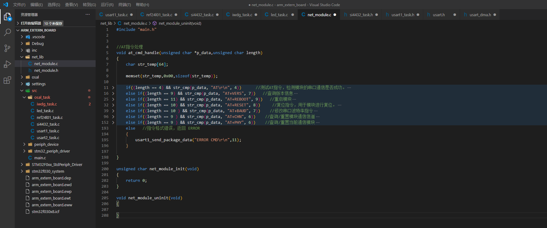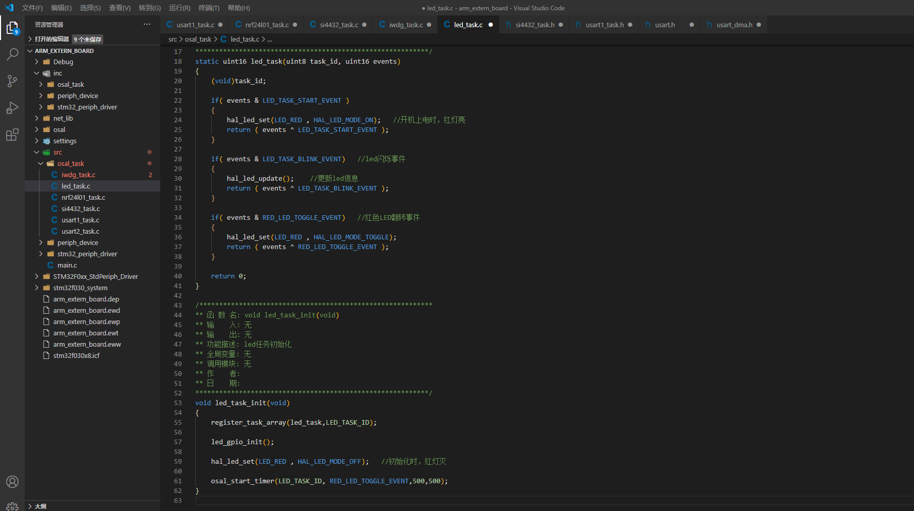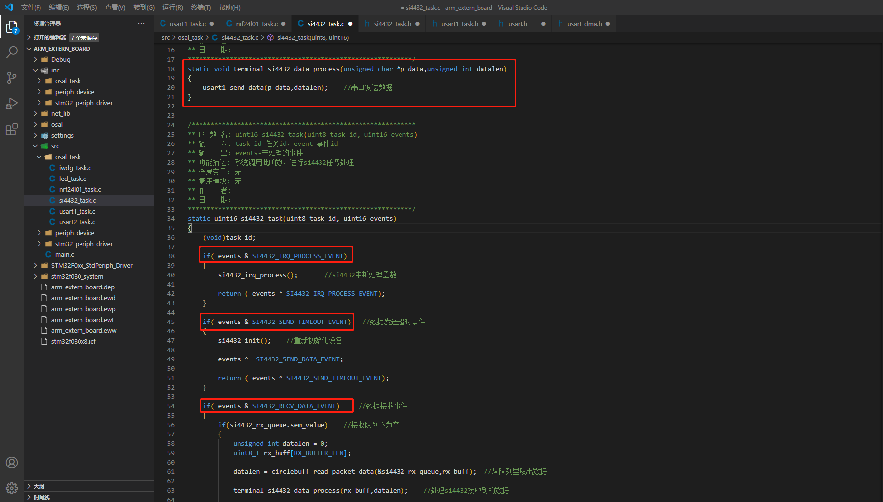 各种任务事件是在si4432_task()这个函数中进行处理的,对于SI4432无线模块接收到的数据,目前都是通过串口透传出去,交给上位机进行处理,各个任务事件的函数内容,如下图所示。