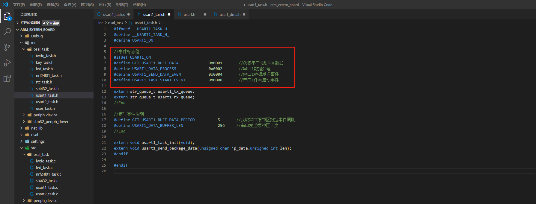 在头文件usart1_task.h中,定义串口1任务相关的事件,主要有串口1数据收发和处理,串口任务启动事件,如下图所示。