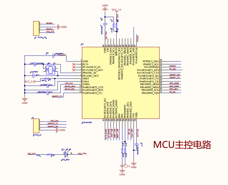 ARM中控扩展模块采用STM32F030C8T6作为主控芯片,这款MCU芯片是Cortex-M0内核,主频48MHz,芯片自带64KB可编程Flash和8KB RAM,很适合物联网终端设备的控制器开发。模块的MCU控制电路如下图所示。