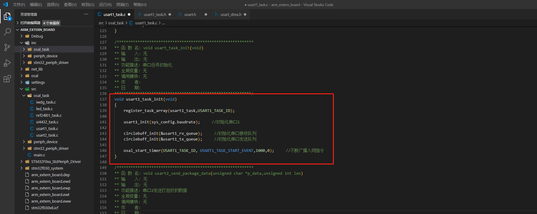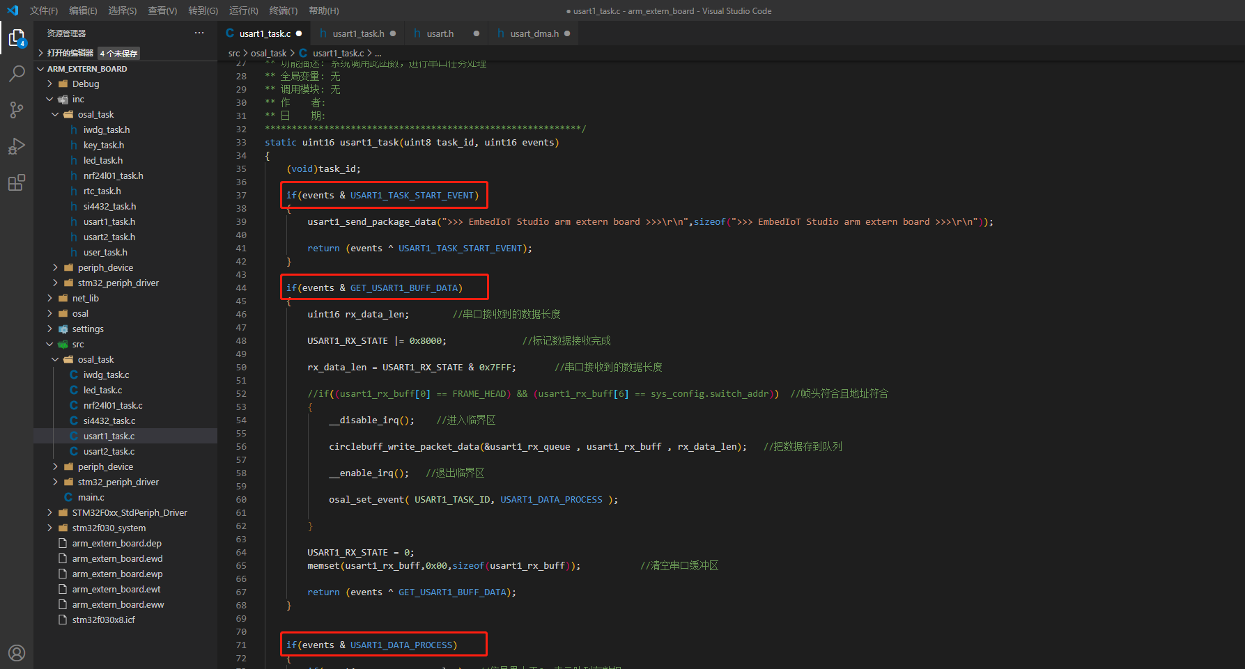 然后在源文件usart1_task.c的usart1_task()函数中,处理各种串口任务事件,OSAL调度器在收到串口的各种事件后,都会在这个函数里面处理各种事件,如下图所示。