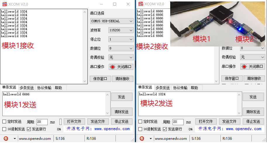 使用两个ARM中控扩展模块,并同时接到PC电脑上,用串口调试工具可以在这两个模块直接互相透传数据,如下图所示。