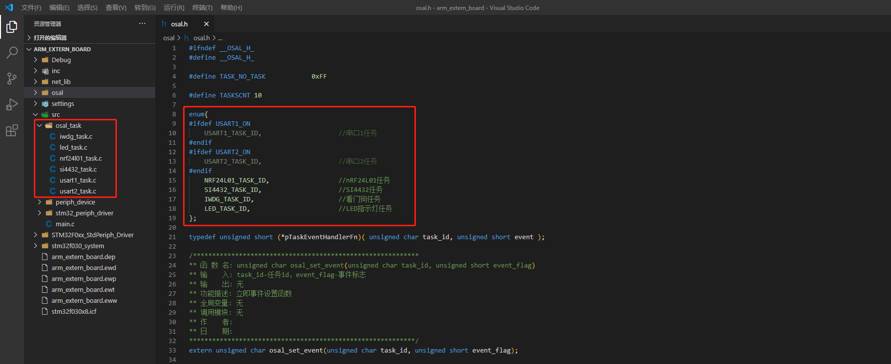 ARM中控扩展模块的软件框架,是基于任务和事件的OSAL调度器来进行开发,ARM中控扩展模块,具有串口通信功能,2.4G和433无线通信功能,看门狗系统监测功能,LED指示灯功能。因此,在软件设计上,把这些功能划分为6个任务,在osal.h中定义好各个任务的ID,并创建各个任务的源代码文件,如下图所示。