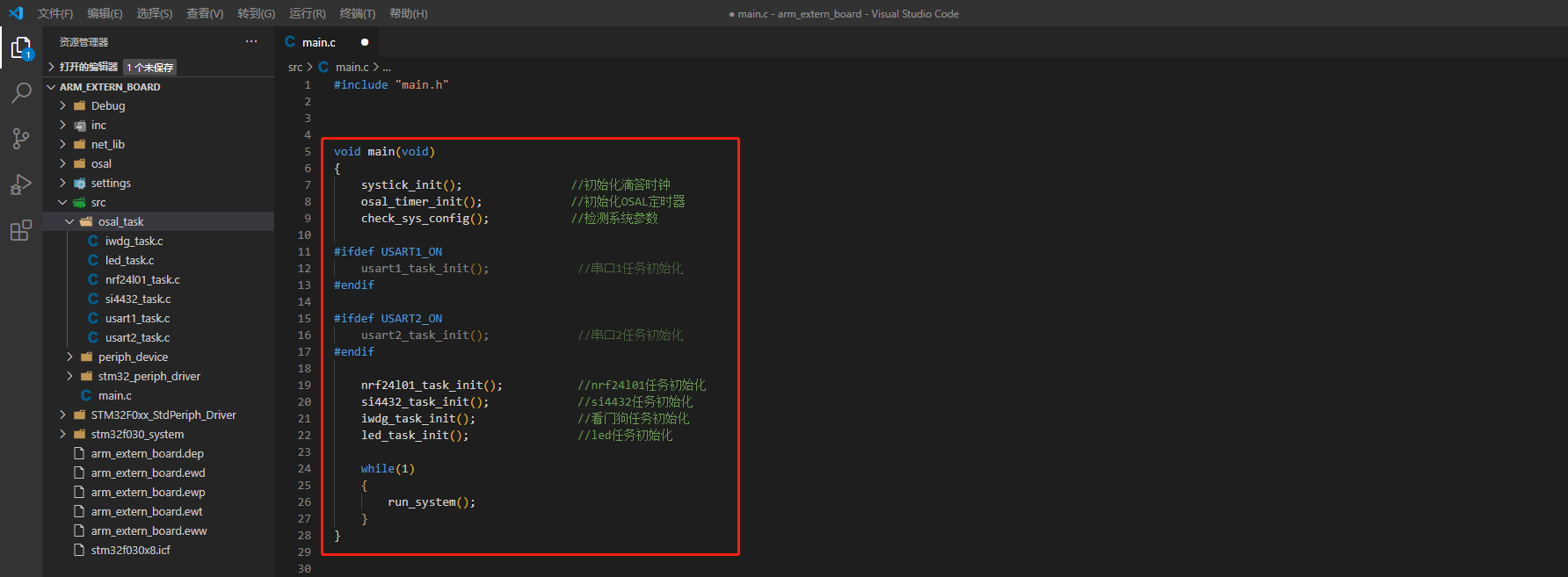 在main.c主函数里面,进行OSAL调度器和各个任务事件的初始化,由于有些设备不一定用到所有串口,因此,通过USART1_ON和USART2_ON这两个宏定义作为串口模块的开关,主函数的内容如下图所示。