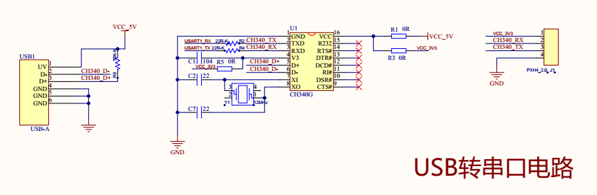 USB转串口电路使用沁恒科技的CH340G作为转换芯片,该芯片可以通过3.3V或5V电源供电,对外引出芯片的TTL接口(使用时需要去掉R2和R4电阻),方便开发者扩展,USB转串口电路如下图所示。