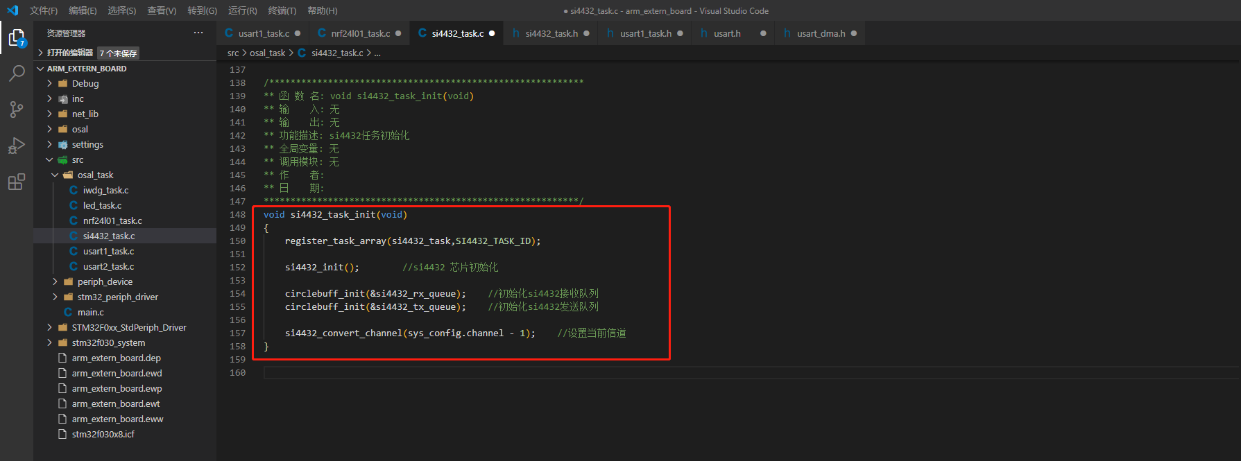 先来看看源文件si4432_task.c里面的任务初始化函数,如下图所示。