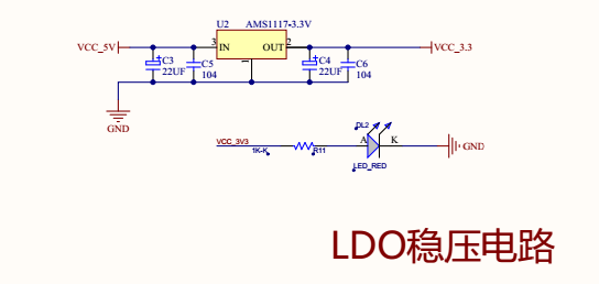 ARM中控扩展模块使用USB接口进行5V供电,模块自带稳压芯片,5V电源通过LDO稳压电路,为单片机及其他模块提供3.3V电源,模块还自带有红色的电源指示灯用来表示模块的通电情况,如下图所示。