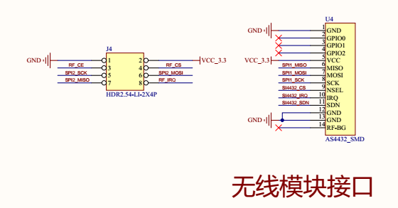 ARM中控扩展模块使用SPI1和SPI2接口跟无线模块进行通信,其中,SPI1接口连接SI4432这款433MHz无线模块,SI4432模块使用焊接方式固定在中控扩展模块上。SPI2接口通过提供接口的方式外引出来,可以用来对接nRF24L01这款2.4GHz无线模块,如下图所示。