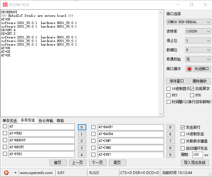 以上就是ARM中控模块的软件开发内容,编译源码并下载到模块中运行,可以使用串口工具测试模块的AT指令是否工作正常,如下图所示。