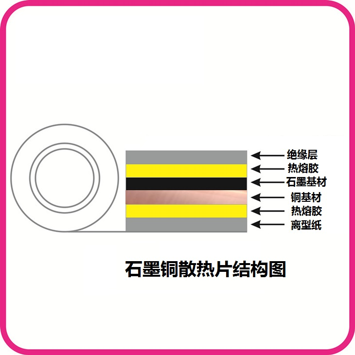1、石墨铜散热片由两种基材和三种辅基材组成:石墨基材、铜基材、绝缘层、热熔胶、离型纸。