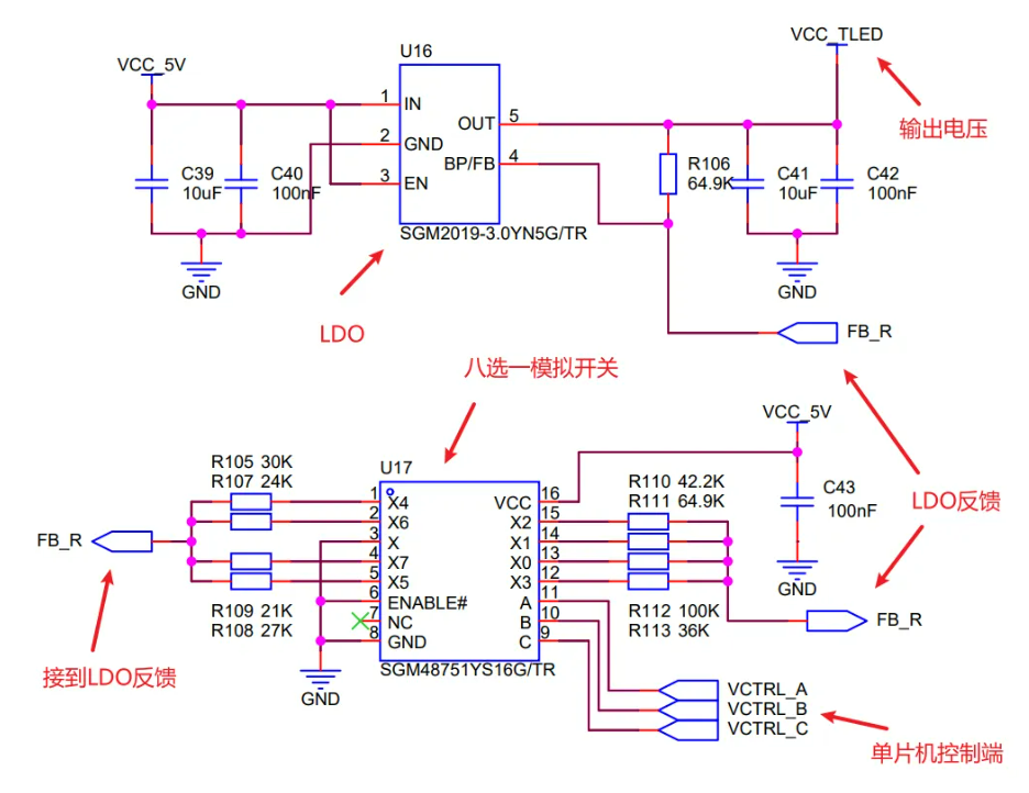 那么以此类推,便可以通过控制VCTRLA,VCTRLB,VCTRLC为000~111这8种状态,来让LDO输出8种不同的电压值,从而达到调节发射灯功率的目的。这种调节输出电压的方式还是很值得学习借鉴的。