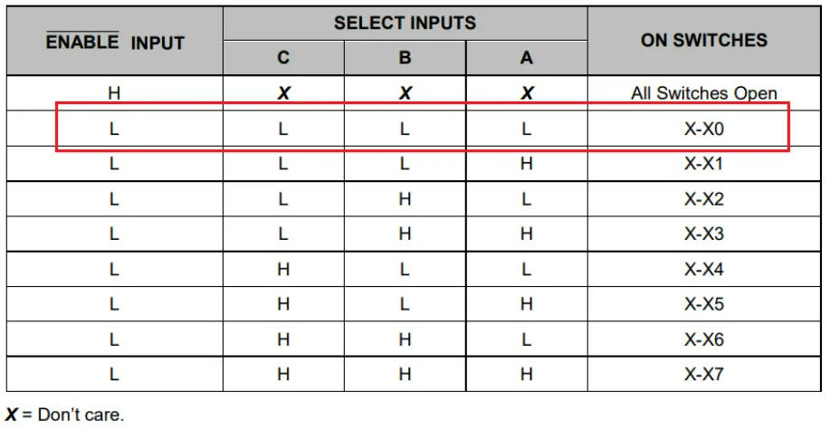 可以看到, 电路通过八选一模拟开关SGM48751选择不同的分压电阻,从而达到让LDO的VCC_TLED输出不同的电压值,例如单片机控制管脚VCTRLA,VCTRLB,VCTRLC输出分别为000,那么将控制X0与通道X相连 ,SGM48751的真值表如下: