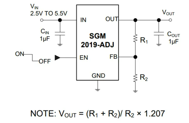 那么 此时LDO的反馈电阻分别为R106 = 64.9K 和R112 = 100K(对应到下图就是R1 = 64.9K,R2 = 100K) ,此时输出电压应该为2V左右。SGM2019的输出电压公式如下图所示: