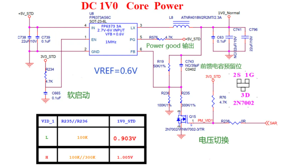 电路图如下,采用Q15控制反馈电阻,上电时,Q15导通,此时反馈电压等于输出电压在50KΩ和75KΩ(100K并联300K)分压值,此时电路输出1V即提供内核启动电压。