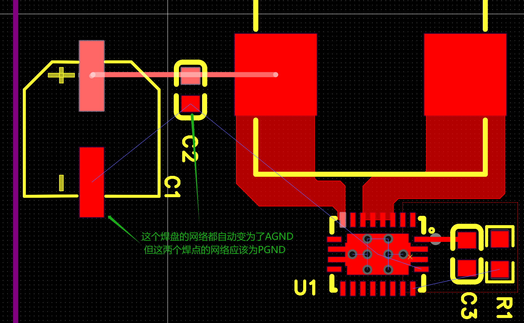 原理图中短接后,点击更新/转换原理图到PCB后,PCB中自动将原两个PGND的焊点转换未为AGND了,见下图绿色箭头所指,这不是期望的结果