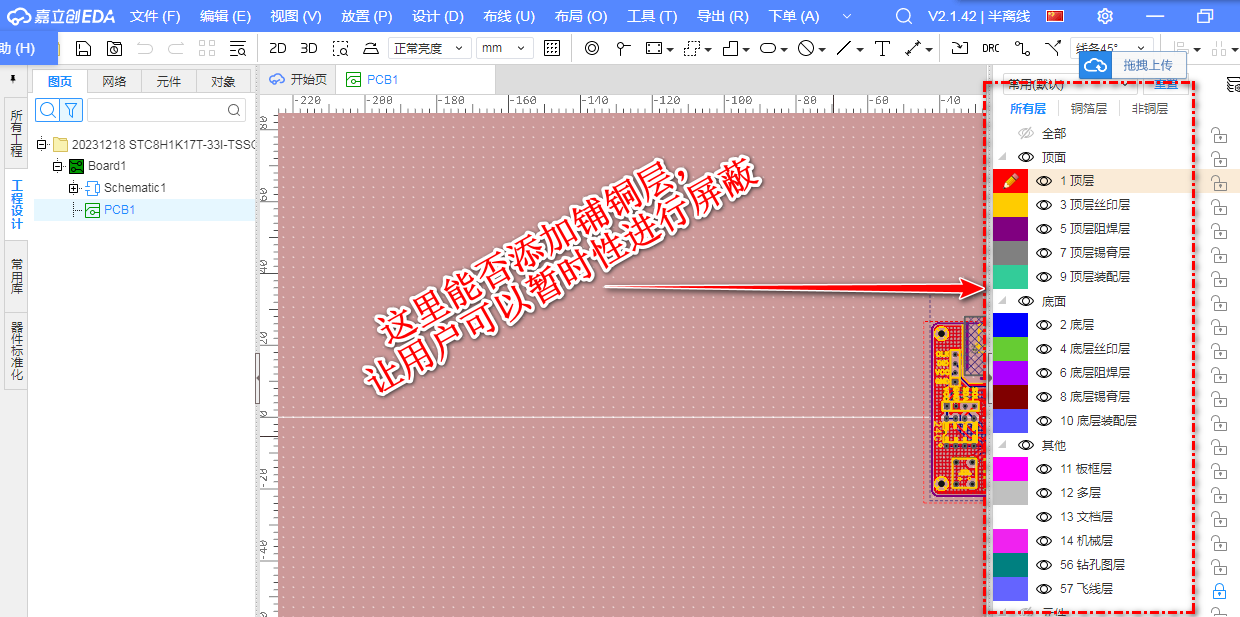 EDA界面右边的图层菜单能否添加铺铜层,方便用户临时屏蔽铺铜层?