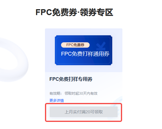 领取条件:上月实付满20可领取(指PCB或FPC订单,其它品牌消费不算)