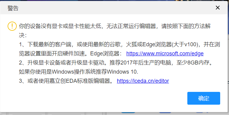 在一月上旬和中旬时使用嘉立创eda专业版时没有任何问题,1月25日打开时显示下图中的警告,并且使用过程中十分卡顿。分别在火狐浏览器和联想应用商店中进行了多次卸载和重新安装,目前还是这个情况。使用的电脑为联想游戏本,2022年购买,不存在显卡性能过低的情况。目前不清楚应该如何解决