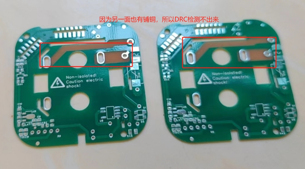 如果这个铺铜消失,也仍然有其他导线连接时,DRC并不会报错,常见于大电流网络双面铺铜。此时就容易遗漏这个。