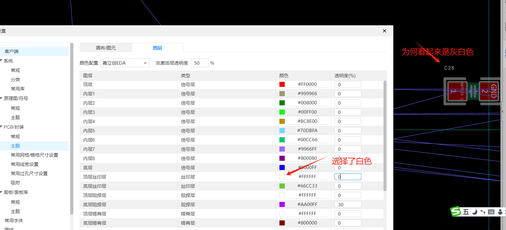 为何丝印层设置颜色是白色,元件丝印看起来是灰色?