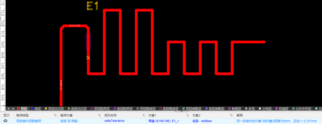 在天线起始端加了一个焊盘作为引脚,要不其他元器件走线不允许连接。加了焊盘是给连接,但DRC的时候提示天线两个元器件距离有错误。这个天线封装应该怎么样画呢