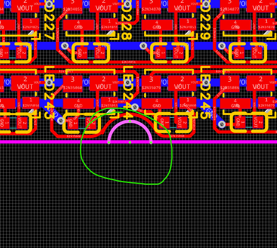 如截图所示,起初绘制了一个矩形的板框图形,现在想在矩形边上挖掉一部分,做一个小的半圆形的凹陷。现在已经在板框层绘制了半圆,但这两部分不能够相交,怎么样才能够两个图相交然后去掉多余的半圆内的直线