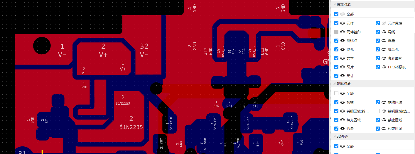 今天打开昨天画的板除了普通,其他焊盘丝印,挖槽板框元器件都看不见了