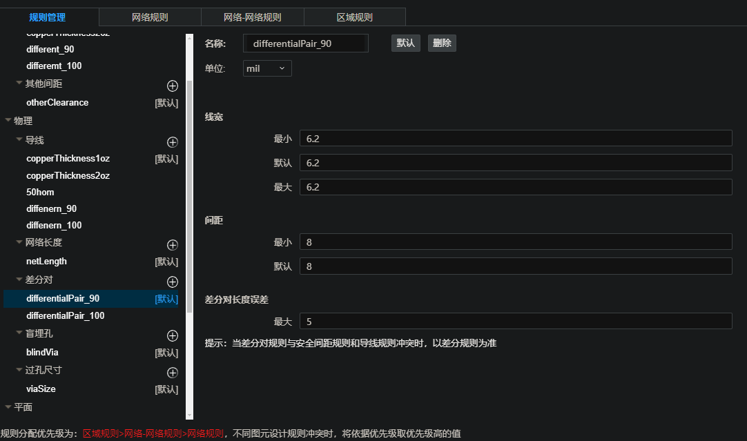在规则设计中,差分对设计线宽线距只有表层的设计,对于多层板,内层的差分线宽,线距无法同步设置。