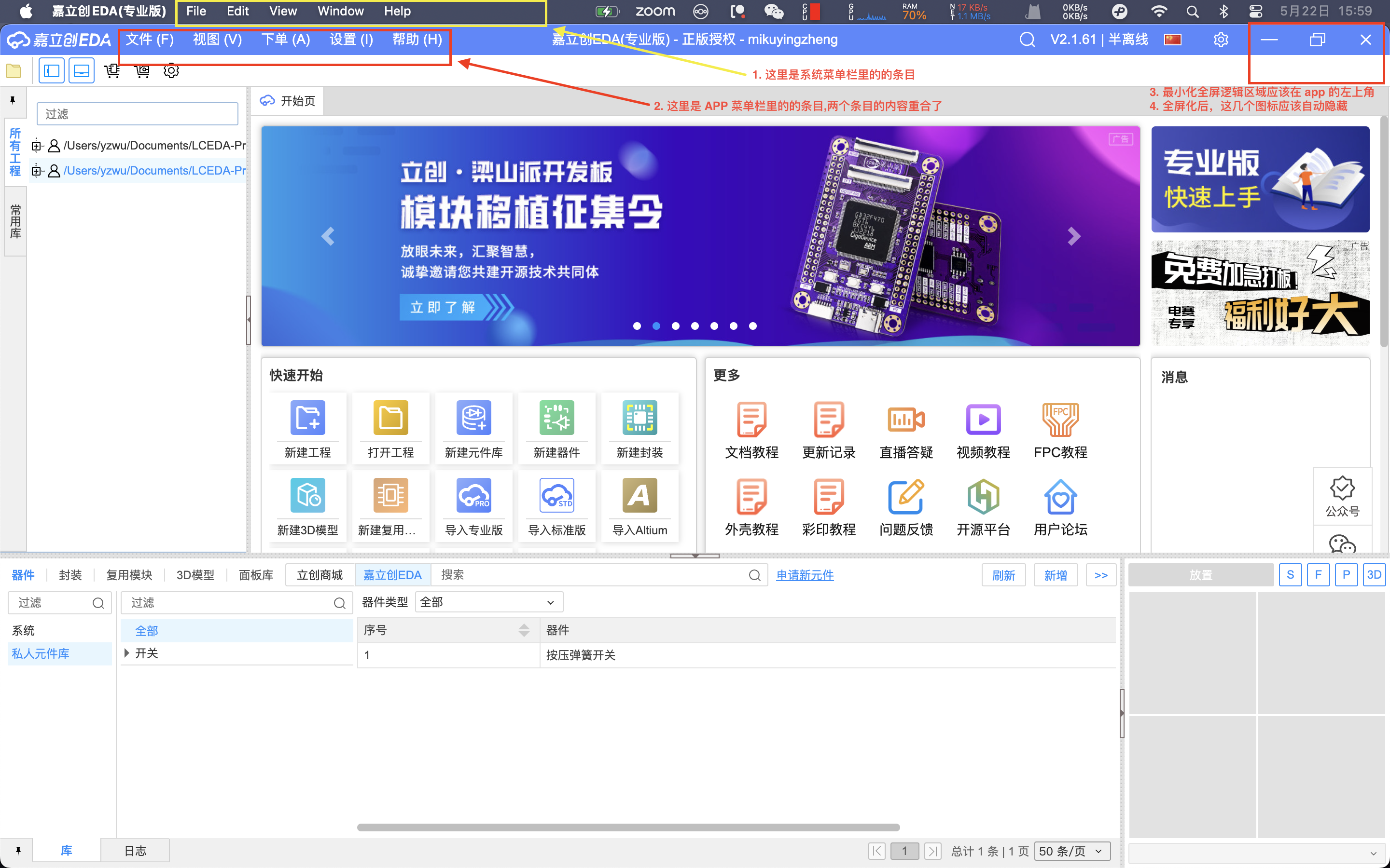 嘉立创 EDA 在 MacOS 下存在如下问题,具体请看截图中的 4 处标记