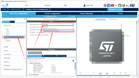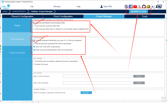 7、在生成工程之前的最后一步(真最后一步了)。点左边的“Code Generator”,然后注意看下面图中的第一框框,我勾选的是第一个,所以在生成代码的时候就会把所有库文件都会添加进工程里,因此会生成的有点慢,并且第一次编译的时候会编译好久,不信你可以试试。这里你也可以选择第二个选项,只把用到的库文件添加进去。
