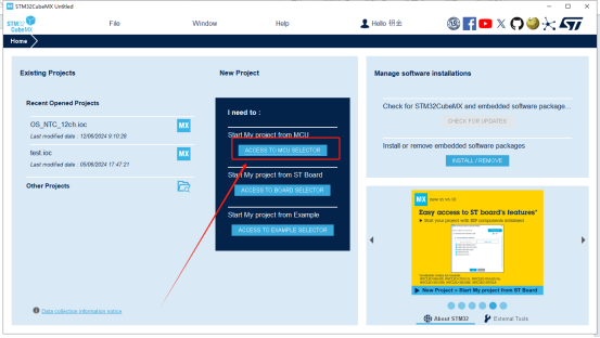 1、打开STM32Cube MX软件,点击中间的三个按钮中最上面的“ACCESS TO SELECTOR”按钮,开启我们的工程创建之路。如下图所示: