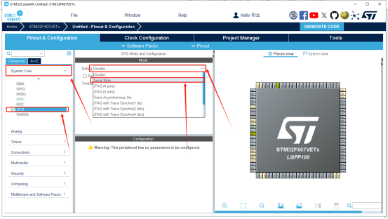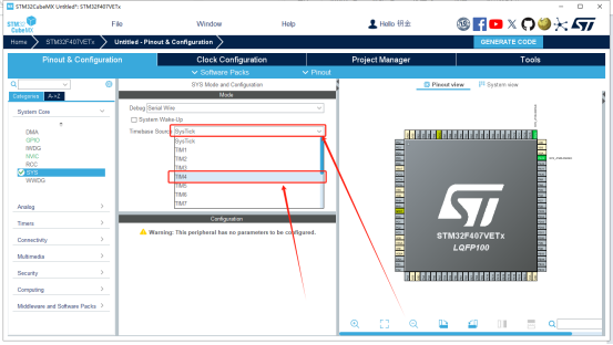 3、点击“System Core”,然后点“SYS”,右边就会出来的框。点击Debug旁边的复选框,他会出来一堆东西,我们选择第二个。接着看下面的“Timebase Source”,即始终基准源,我们选择“TIM4”,不使用默认的“SysTick”。大概原因是“SysTick”要忙其他东西,再选他就忙不过来了。如下图所示: