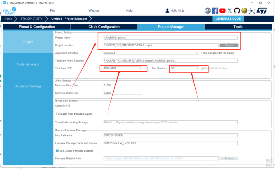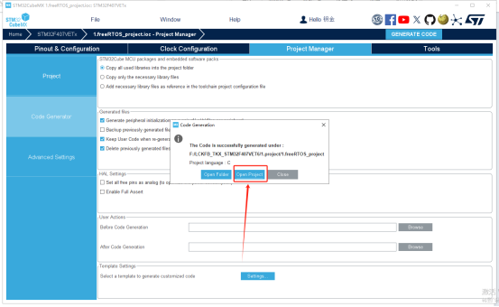 8、生成成功!我们点击消息框框里中间的蓝色按钮“Open Project”打开工程看看吧!然后在工程里点击编译。(这里我没有放出来点击编译的图,如果不会就把这篇文章关闭吧)最后0 error,0 warring编译成功。至此成功创建了一个天空星(STM32F407VET6版)的FreeRTOS的空工程。