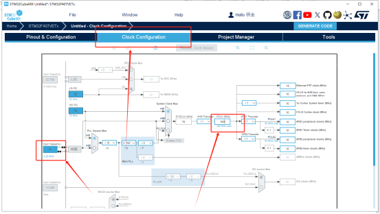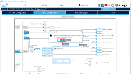 4、上边的配置完后点击左边栏中的“RCC”,点击“HSE”旁边的复选框,选择第三个“Crystal/Ceramic Resonator”。然后点击头上的“Clock Configuration”来配置一下时钟树,因为我们的天空星上面使用的晶振是“8MHz”,因此在左边第一个蓝框框里填上数字8,再找到下面有“168 MHz max”字样的框框,然后就在这个框框里输入168,然后按下回车,他会弹出来一个消息框框,问你这么搞O不OK,所以就点OK,或者再按一下回车即可。如下图所示:
