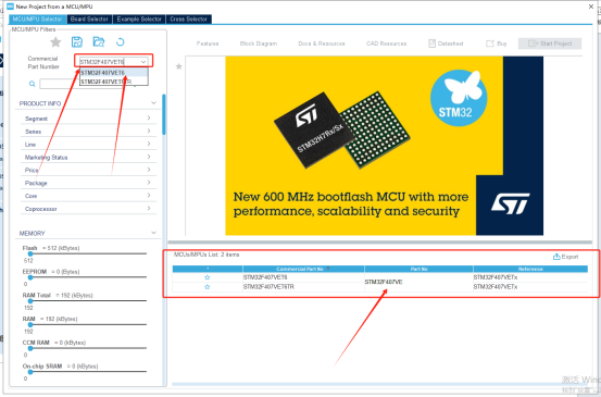 2、在左上角的第一个框框中输入芯片的型号,我们的天空星的芯片型号是STM32F407VET6,所以把“STM32F407VET6”输入进去,然后点击右下角中箭头指的地方,双击鼠标。如下图所示: