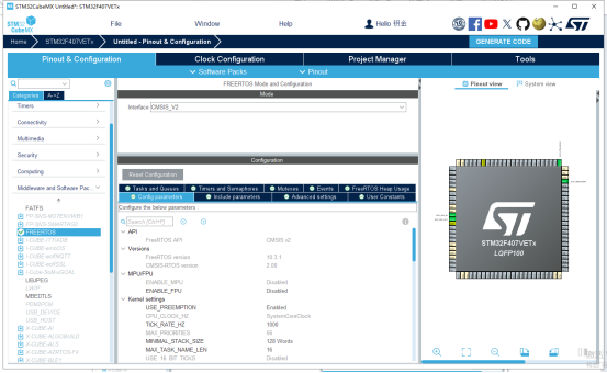 5、下面就可以配置Free RTOS了。把左边的框框们往下拉,找到“Middleware and Software Packs”并点击,点击“Interace”旁边的复选框,这里我选择了“CMSIS_V2”,听韦东山老师说这个版本兼容性更好?然后下面那个框框里的配置内容,如果小白如我就全部选择默认,不必更改。如图所示: