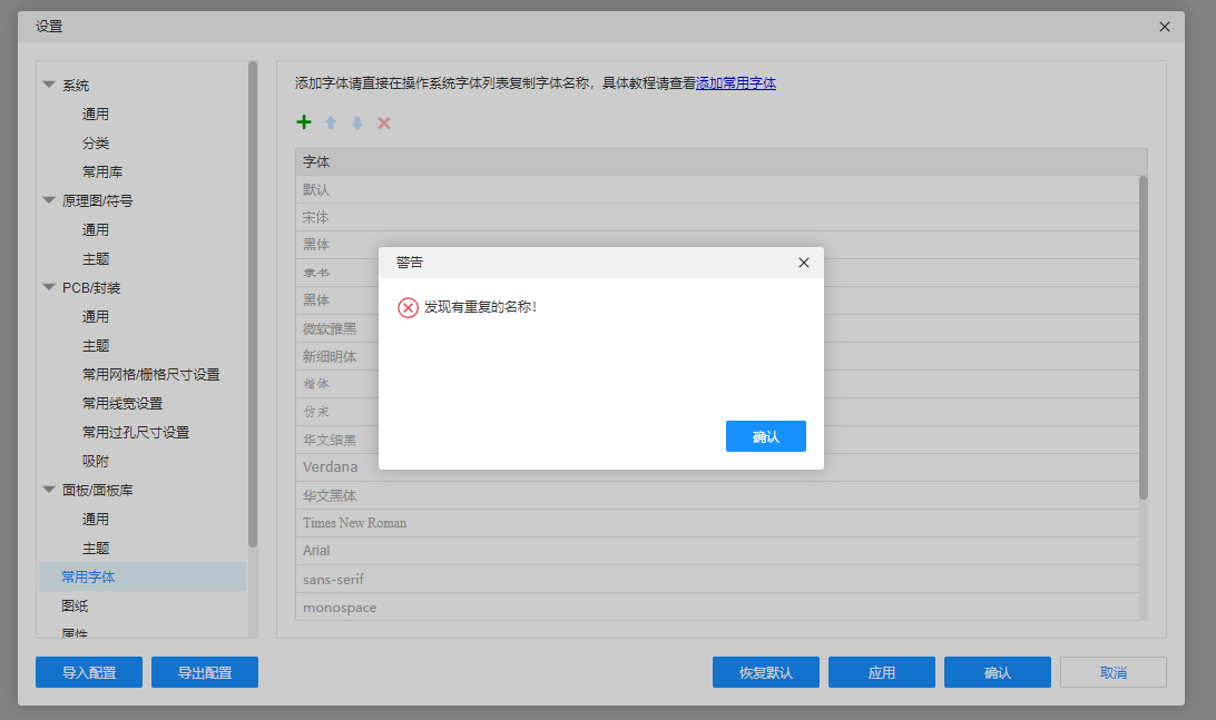 在LCEDA专业版中修改图框中的公司名和绘制者名称时提示 发现重复的名称,不能修改,取消显示明细 也是同样的提示,请问是哪个地方重复了,