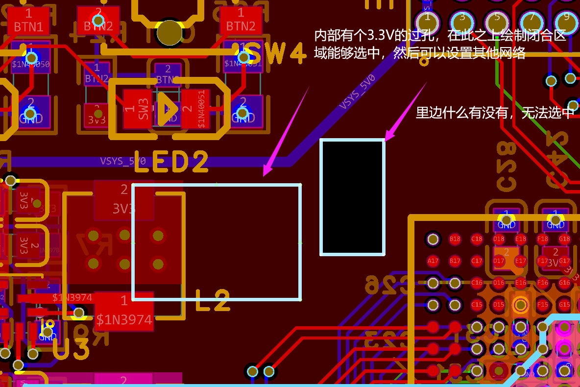 内电层无法无法选中闭合区域,因此无法设置网络,不知道怎么回事
