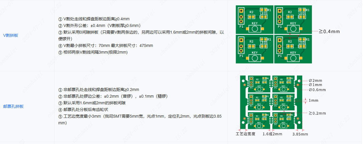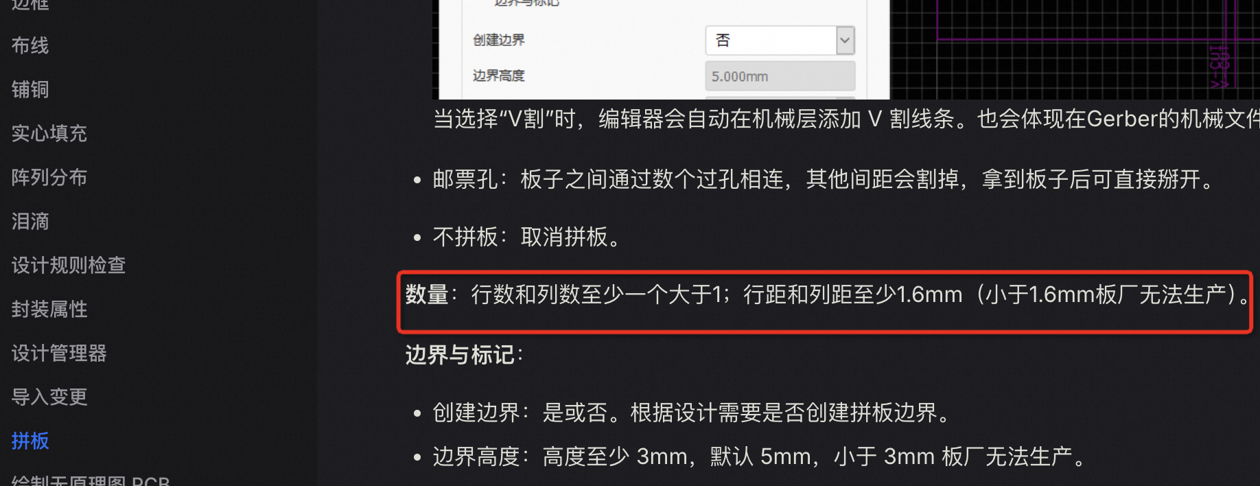 V割也要设定行距和列距吗?感觉这个距离是在创建邮票孔案例时,为了挖那个板件的长孔而设的最小钻头大小。 但V割不需要挖孔呀。