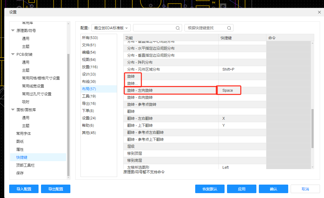 嘉立创eda专业版按空格键旋转功能时灵时不灵,是否设置错了?