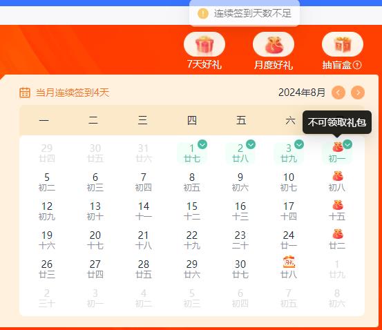 RT,连续签到7天好礼的礼包无法领取,提示:"连续签到天数不足.","未达到领取条件"