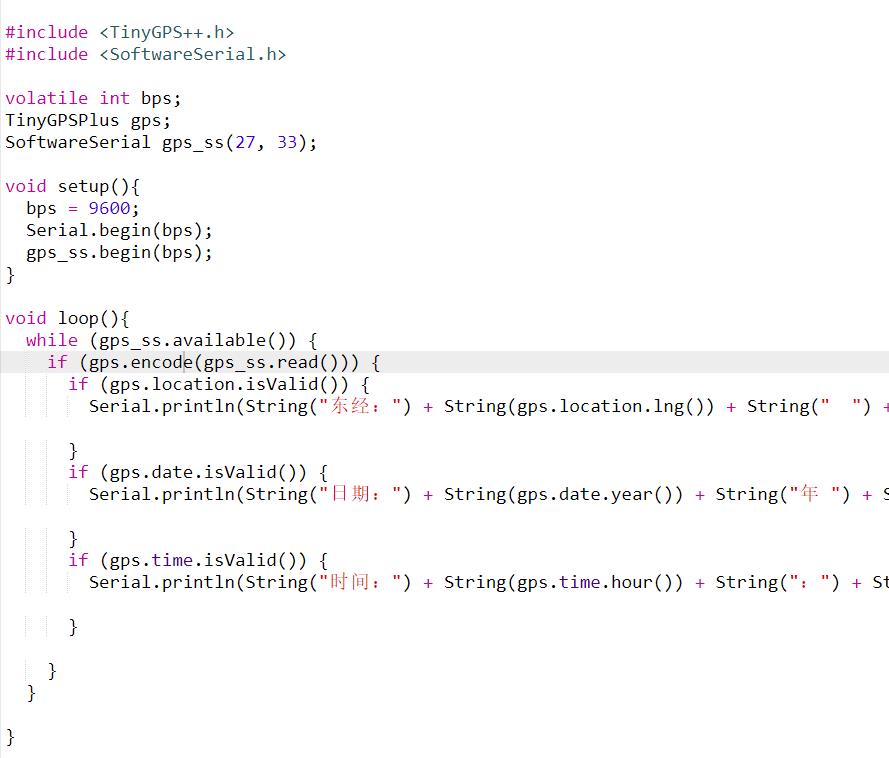 Serial.println(String("东经:") + String(gps.location.lng()) + String(" ") + String("北纬:") + String(gps.location.lat()));