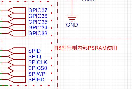 如图,原理图中看到了R8型号则内部PSRAM使用,是不是只有在没焊接PSRAM芯片才有效?在代码中如何去调用GPIO33-37等接口?