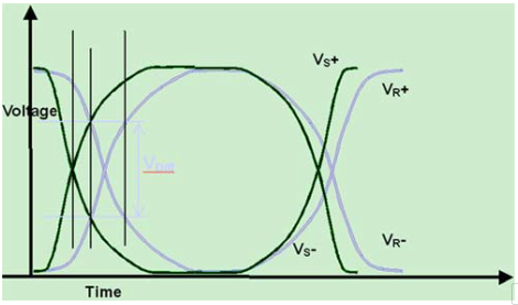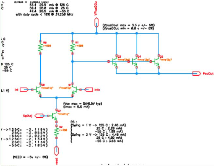 3,差分信号通常进入差分驱动电路,放大后得到差分信号。最简单的就是差分共射镜像放大器电路了,这 个在一般的模拟电路教材都有介绍。下图是某差分放大器件的spice电路图和输出信号波形,一般需要他们完全反相,有足够的电压差大于差模电压门限。当然信号不可避免有共模成分,所以差分放大器一个很 重要的指标就是共模抑制比Kcmr=Adm/Acm。