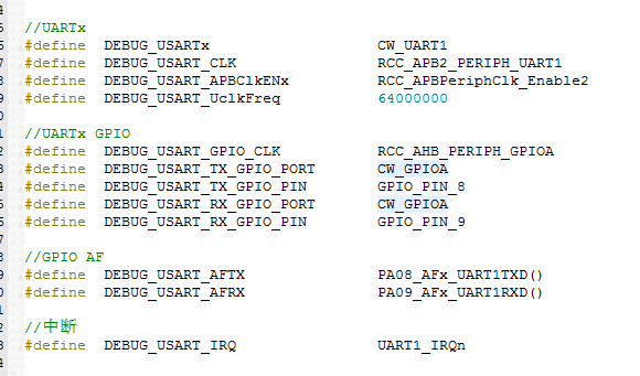 这段是不是应该这样理解,#define DEBUG_USART_CLK 是自己重新定义的一句话,然后他对应的是"RCC_APB2_PERIPH_UART1",就是初始化UART1时钟的意思.